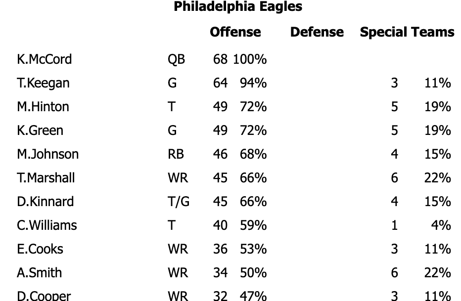 Nick Muse’s special teams playing time really stands out. The Eagles got a long look at him there. Ditto for Cameron Latu, who has really stood out on that unit but not on offense.