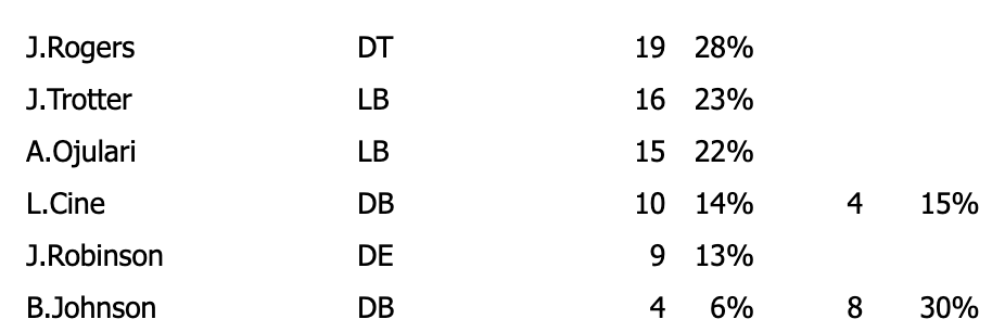Ty Robinson did not log a stat in the box score. He did help to collapse the pocket to prevent the quarterback from being able to step up on Patrick Johnson’s sack.