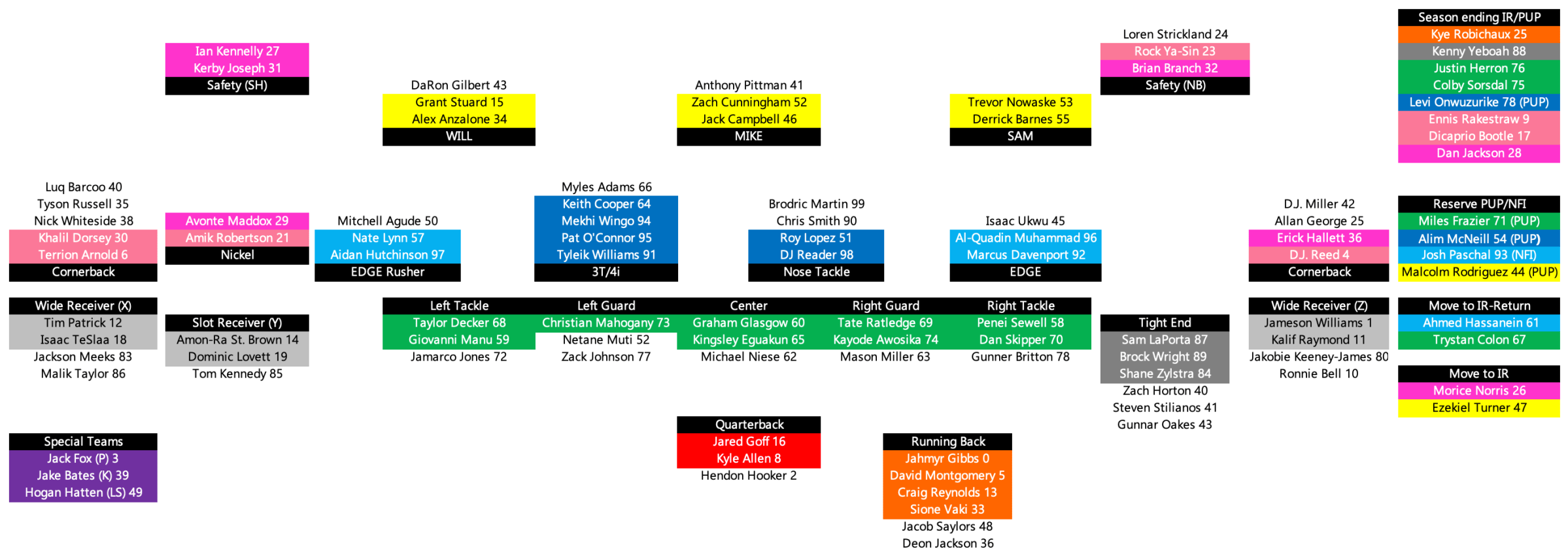 Norris could be another candidate for Return/Injured Reserve, but with no real update from Campbell to suggest otherwise, I have him moving to season-ending injured reserve. If the Lions do want to keep his ability to return open—as well as Hassanein and Colon—they’ll need to do a bit of roster gymnastics.