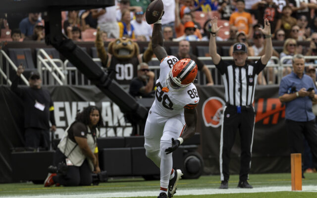 Cleveland Browns tight end Harold Fannin Jr. (88) catches a touchdown pass during a pre-season NFL football game, Saturday, Aug. 23, 2025, in Cleveland. (AP Photo/Matt Durisko)