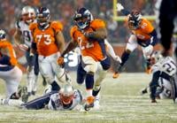 Denver Broncos running back C.J. Anderson (22) breaks free for the game-winning touchdown against the New England Patriots during overtime of an NFL football game, Sunday, Nov. 29, 2015, in Denver. The Broncos defeated the Patriots 30-24. (AP Photo/Jack Dempsey)