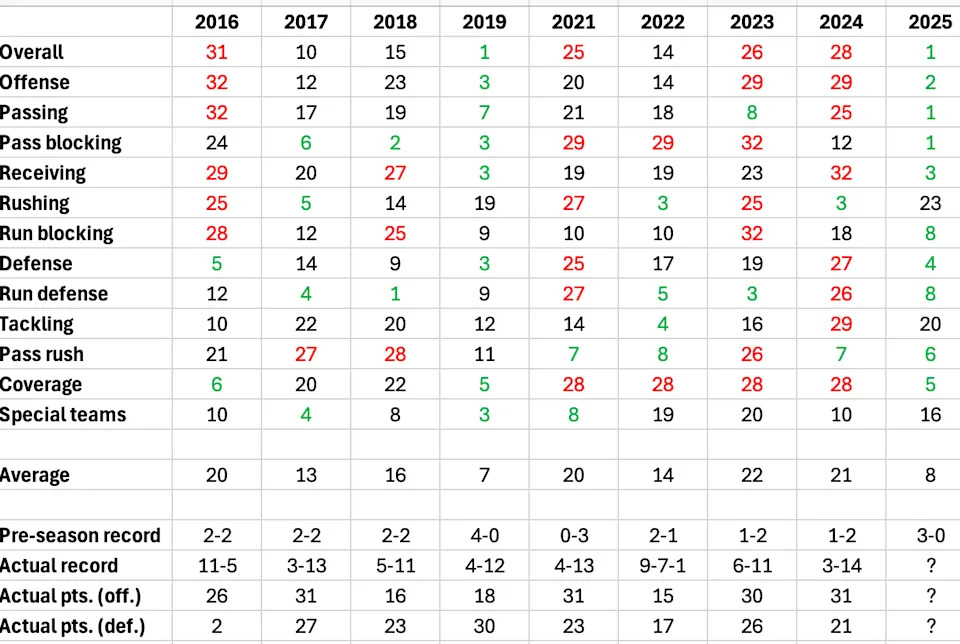 If PFF pre-season grades were actually a harbinger of the season to come, they would suggest that the 2025 team is going to be scary good. They were PFF’s top overall team, second in offense, fourth in defense. They were in the top three in overall offense, passing, pass blocking, receiving, and run blocking. The defense wasn’t quite as dominant, but it still finished in the upper quartile in overall defense, run defense, pass rush, and pass coverage.