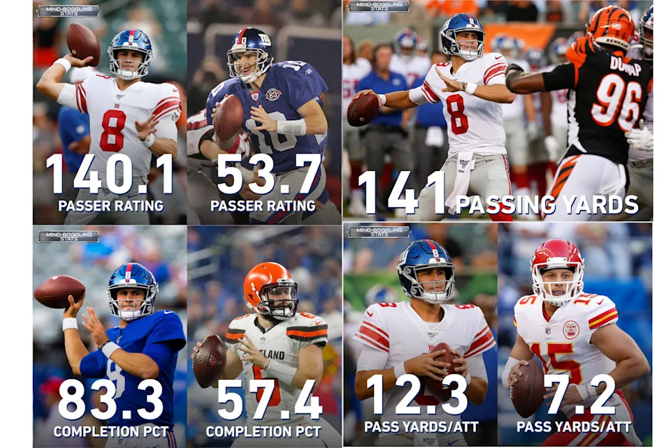 Here for example is a montage of figures from an article in NFL.com entitled, “Mind-Boggling Stats: How Daniel Jones’ preseason stacks up vs. Manning, Mayfield”: