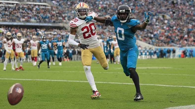 Jacksonville Jaguars wide receiver Calvin Ridley (0) can’t haul in a reception as San Francisco 49ers cornerback Ambry Thomas (20) pressures during the third quarter of an NFL football game Sunday, Nov. 12, 2023 at EverBank Stadium in Jacksonville, Fla. The San Francisco 49ers defeated the Jacksonville Jaguars 34-3. [Corey Perrine/Florida Times-Union]