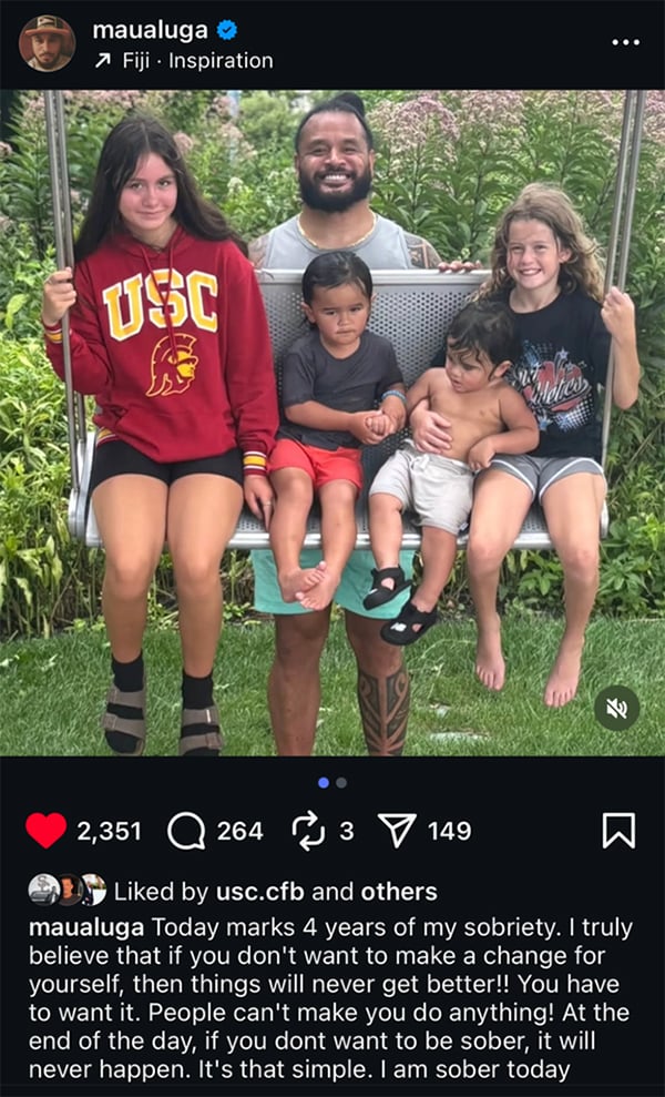 Rey Maualuga’s instagram post marking four years of sobriety, with his children Avayah, far left, Dylanne, Malosi and Ryanne. (Image provided)
