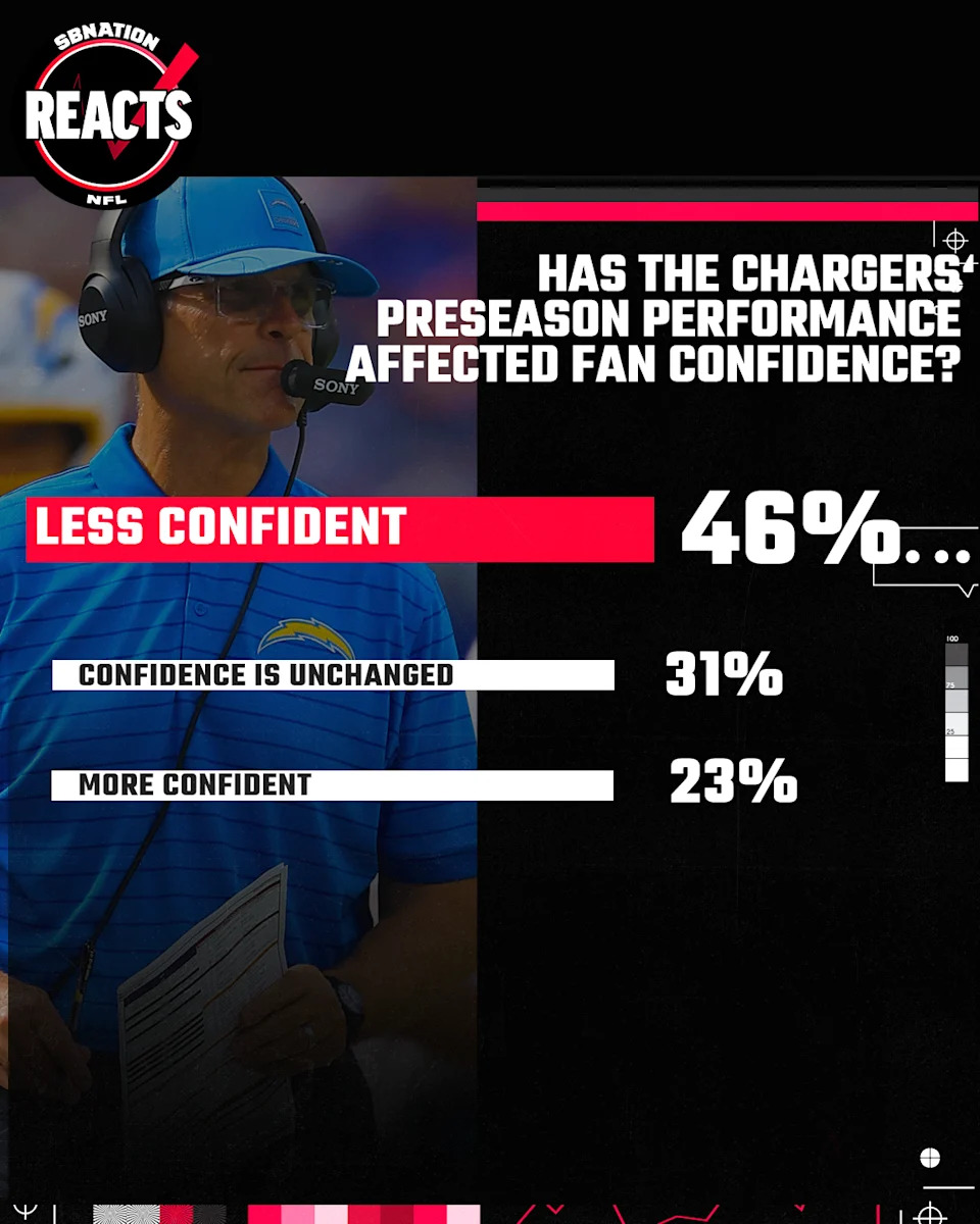 But not all are among the plurality of lesser confidence. Nearly one-third of Chargers fans have the same confidence as before. And nearly one-fourth of fans listened to training camp reports, watched the preseason and came away more confident than before.
