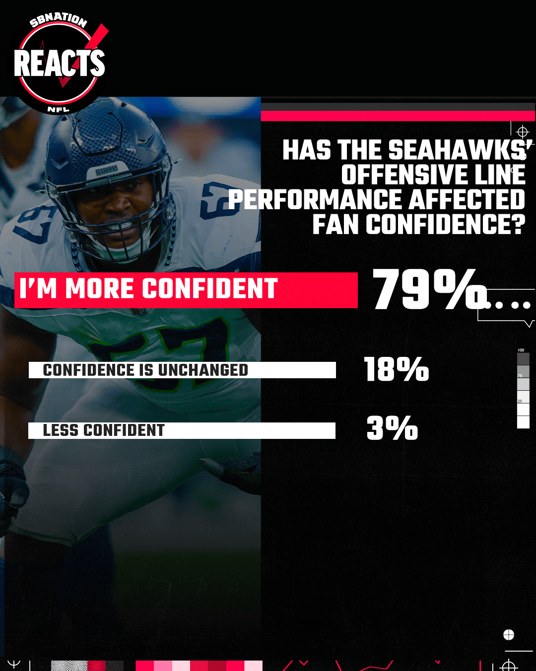 With this in mind, the performance of the offensive line significantly impacted fan confidence in the latest Reacts survey — a whopping 79% said that they felt more confident about the team after seeing the o-line perform this preseason, ushering in a new sense of hope for Klint Kubiak’s offense. Suffice it to say, fans are more enthused about the o-line with this new coaching staff.