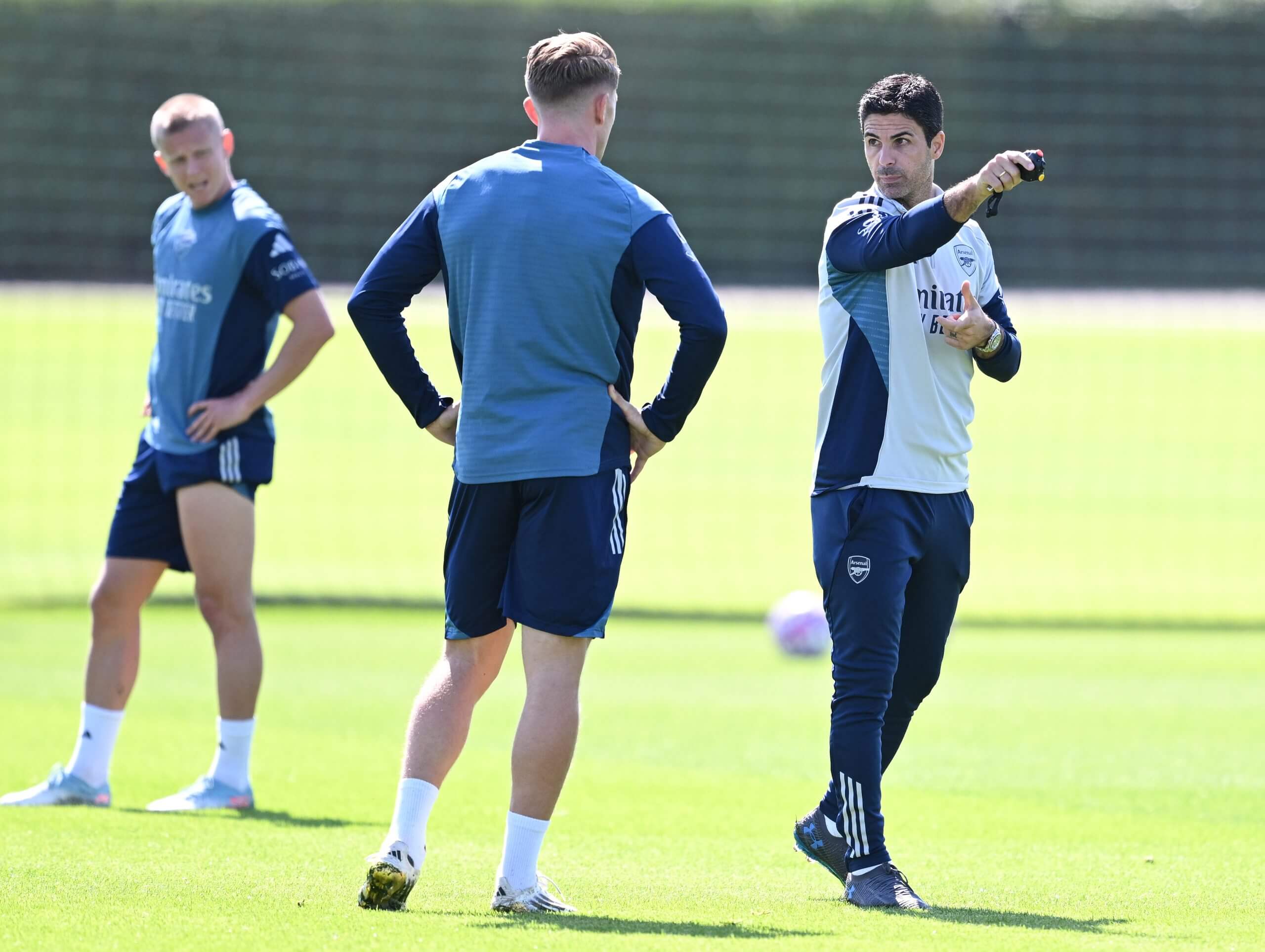 Arteta talks to Viktor Gyokeres during Arsenal training (David Price/Arsenal FC via Getty Images)
