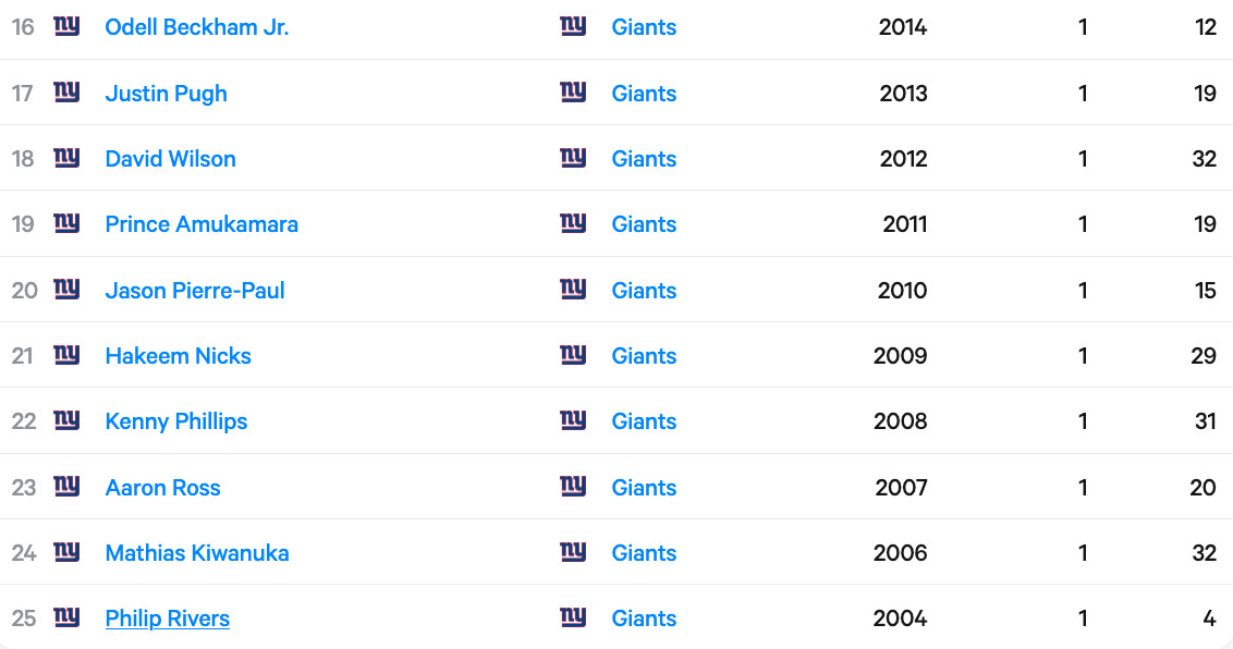 It’s very impressive. There wasn’t a single pick who was an outright failure. There were a couple whose careers were derailed by injuries (Kenny Phillips, David Wilson) and a couple of others who were good but not great players (Aaron Ross, Prince Amukamara). The other six, though, were important contributors (including the guy they traded Philip Rivers for), and a few of them were elite. The most impressive thing is that in most of those years the Giants drafted in the lower half of the first round.