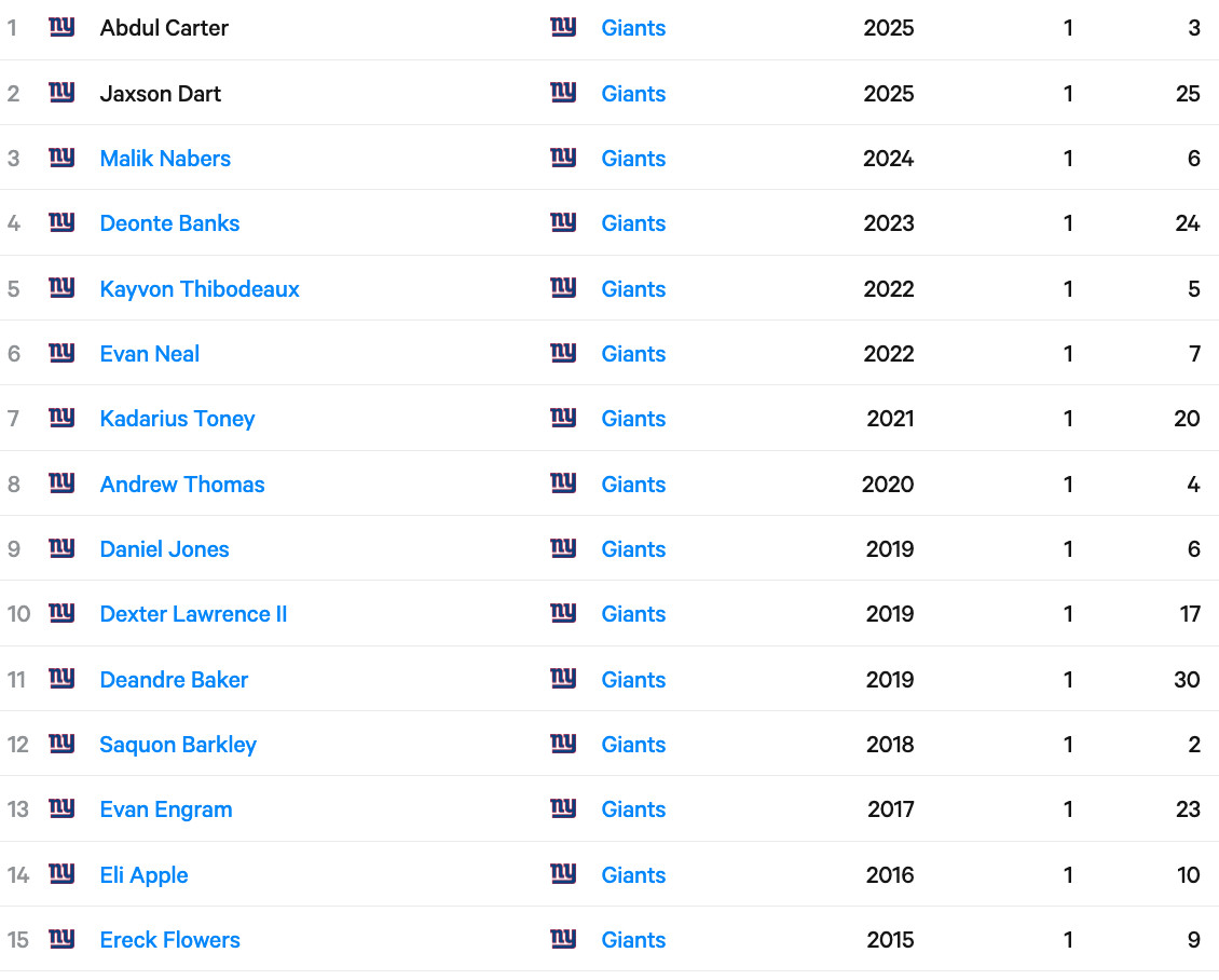 Some outright terrible picks (Ereck Flowers, Eli Apple, Deandre Baker, Kadarius Toney). Some who became significant contributors but were not good enough (Evan Engram, Daniel Jones, Deonte Banks so far). Really only Saquon Barkley, Dexter Lawrence, and Andrew Thomas can be considered elite, though Malik Nabers seems sure to reach that status if he finds a quarterback who can get him the ball. Kayvon Thibodeaux is somewhere in the middle, Evan Neal somewhere below the middle leaning toward terrible, and we’ll see about this year’s picks, Abdul Carter and Jaxson Dart. This checkered record has occurred despite the Giants drafting in the top 10 about half the time.