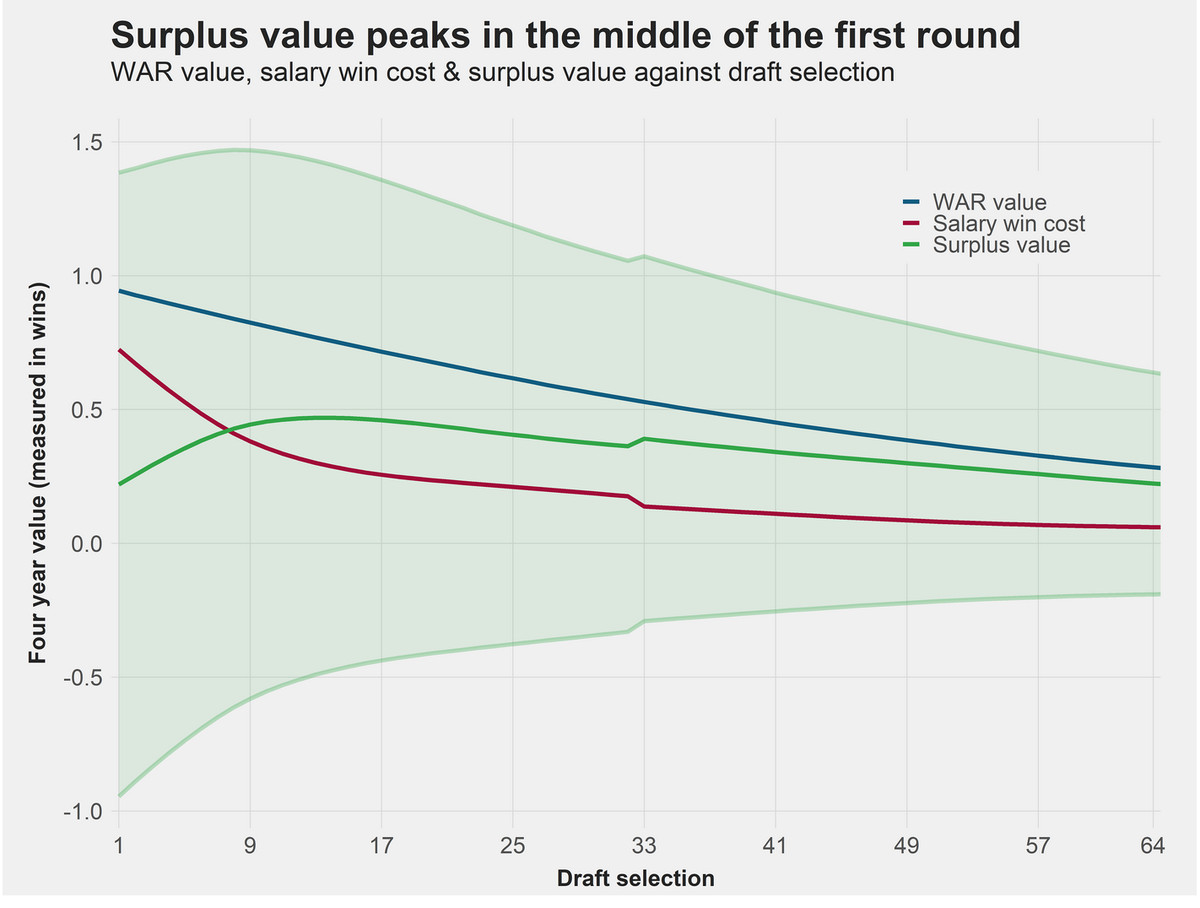You can see that WAR declines slowly over the first two rounds while cost declines sharply over the top 10 picks. Thus, surplus value (the green curve) peaks after the top 10, and it remains higher than the surplus value of the top 5 picks throughout the rest of the first round. That certainly jibes with the early 21st Century Giants playoff teams, who got tons of good to great players in the bottom half of the first round.