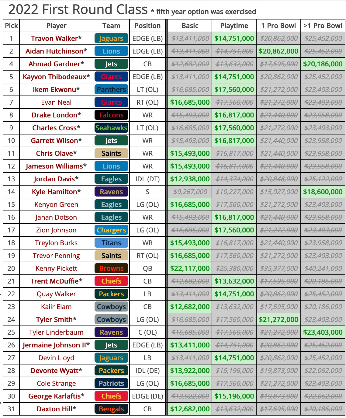 Is the 2022 class the start of a new trend or is it just an outlier? It was only a year before that the No. 2, 3, and 4 picks were Zach Wilson, Trey Lance, and Kyle Pitts. (Pitts’ option was actually picked up but most observers view him as falling short of his pre-draft promise.) Even the 2020 class that is remembered as having many great players at the top had 6 in the top 14 who did not have their fifth year option exercised (Chase Young, Jeff Okudah, Isaiah Simmons, C.J. Henderson, Mekhi Becton, Javon Kinlaw).