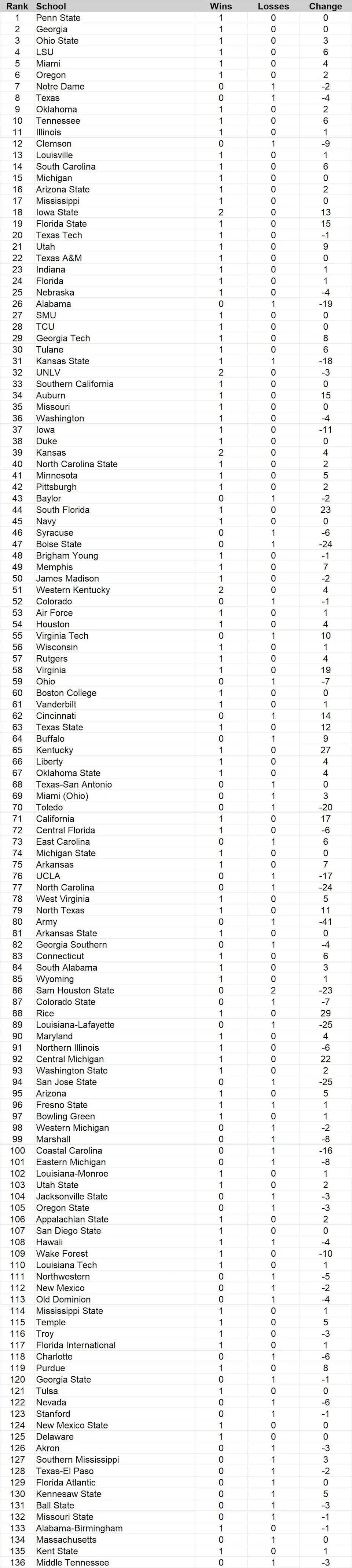 The 1-136 features double-digit movement across the board, which is par for the course coming out of the first full weekend of the regular season. Among the teams making the biggest movement are No. 19 Florida State (up 15), No. 26 Alabama (down 19), No. 34 Auburn (up 15), No. 44 South Florida (up 23) and No. 77 UCLA (down 18).