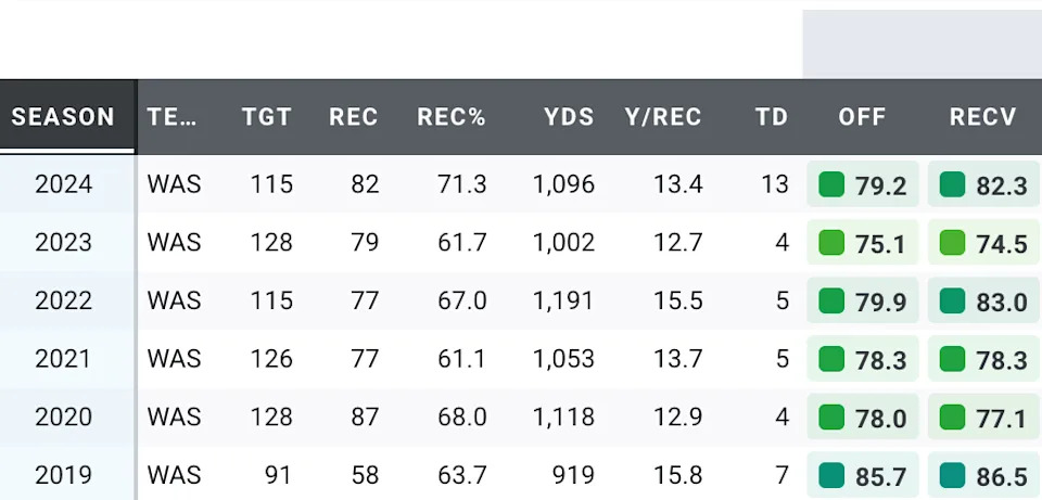 McLaurin has been remarkably consistent in his career, but he never had more than 7 TDs in a season until 2024. It’s not that he played any better last season than in previous years. Here are ESPN Analytics tracking metrics for his career. ESPN uses NFL Next Gen Stats to track how well receivers get open, how well they catch passes thrown to them, and how many yards after catch they get. The results are reported as percentile rankings among all wide receivers with at least 30 targets. Here are McLaurin’s season-by -season percentile rankings: