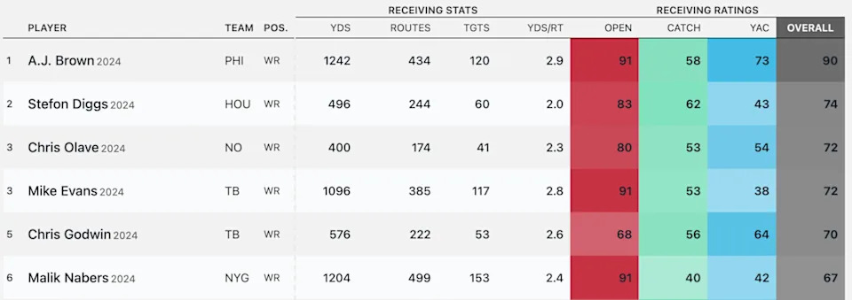 Nabers was sixth among NFL wide receivers overall, and tied for first in getting open: