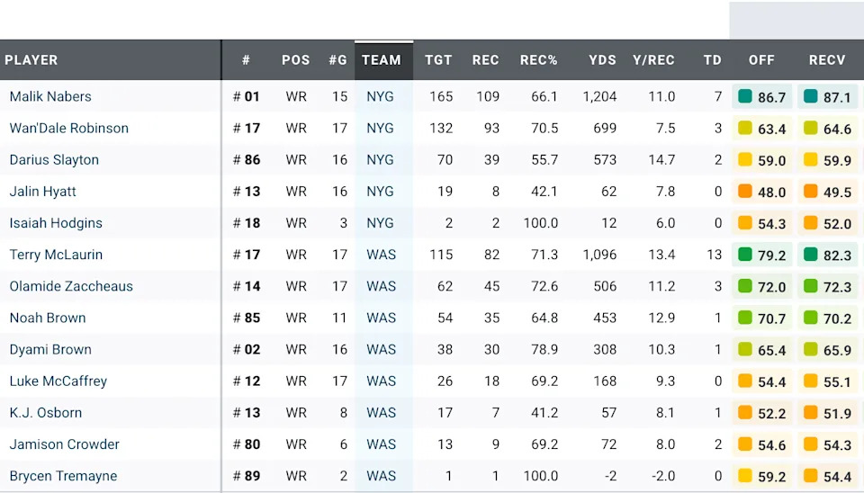Here are the somewhat remarkable statistics for the Giants’ and Commanders’ wide receivers. last season: