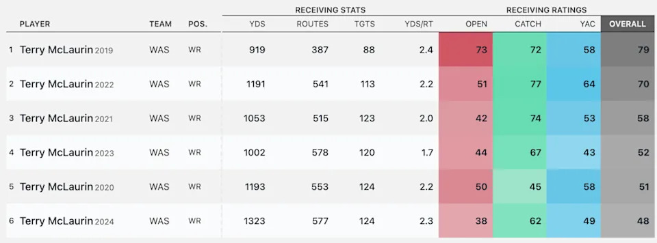 Malik Nabers had more receptions and yards, plus a higher PFF receiving grade, than the Commanders’ newly re-signed Terry McLaurin. McLaurin, though, scored 13 TDs, second only to Ja’Marr Chase among wide receivers. In that regard, McLaurin’s season was an outlier in his career: