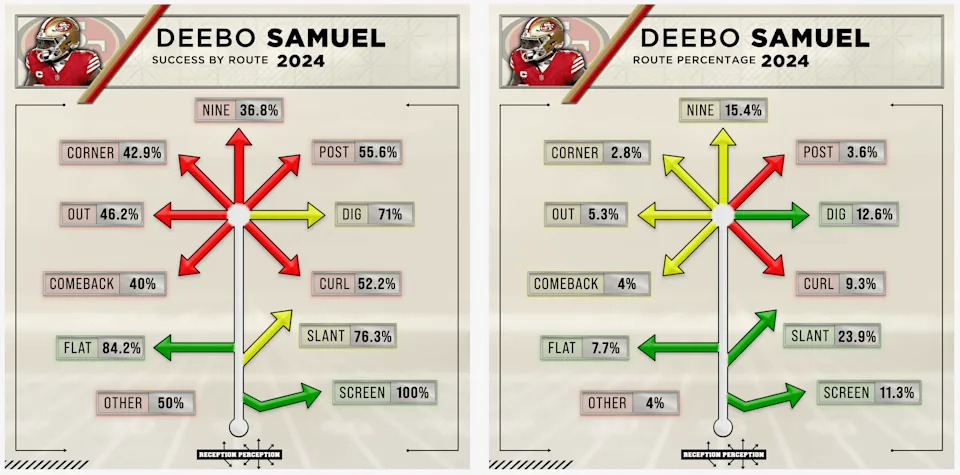 Deebo has distinct preferences as a wide receiver, especially at this point in his career. He runs shallow routes more than most wide receivers, and has more success with them than most receivers: