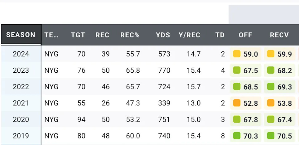 There was a time long ago, when Daniel Jones was a rookie (2019) and wasn’t afraid to throw downfield to his fellow rookie, that Slayton was in the 61st percentile of NFL receivers. Then Joe Judge and Jason Garrett put Jones in bubble wrap and Slayton declined in 2020 and especially 2021 (half of which Slayton spent with Mike Glennon and Jake Fromm throwing to him after Jones’ neck injury). He made a comeback in 2022 in the Brian Daboll-Mike Kafka offense, and even in 2023, when Tyrod Taylor wasn’t afraid to throw deep to him. Last year, though, he was a forgotten man in the offense with the Giants’ quarterback carousel. Look at how his TDs have declined: