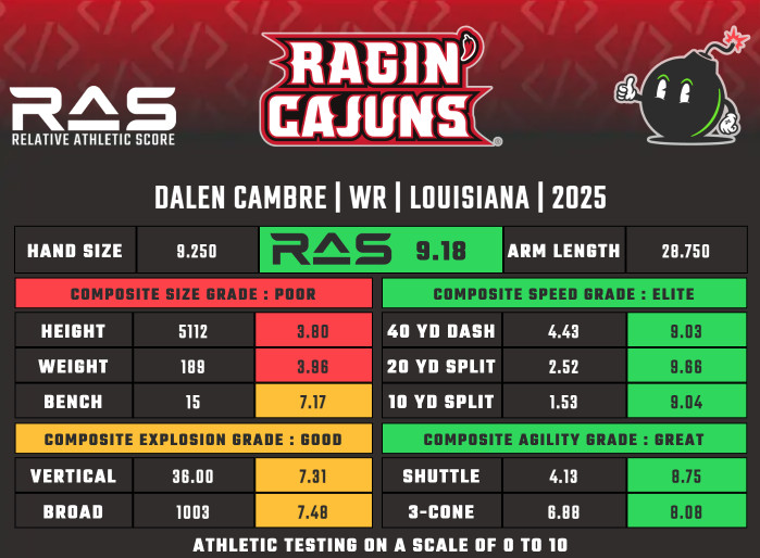 Cambre is a bit undersized for an NFL receiver at 5-foot-11, 189 pounds, but an impressive athlete for the position. He has good long speed with a 4.43-second 40-yard dash, as well as very good quickness and agility.