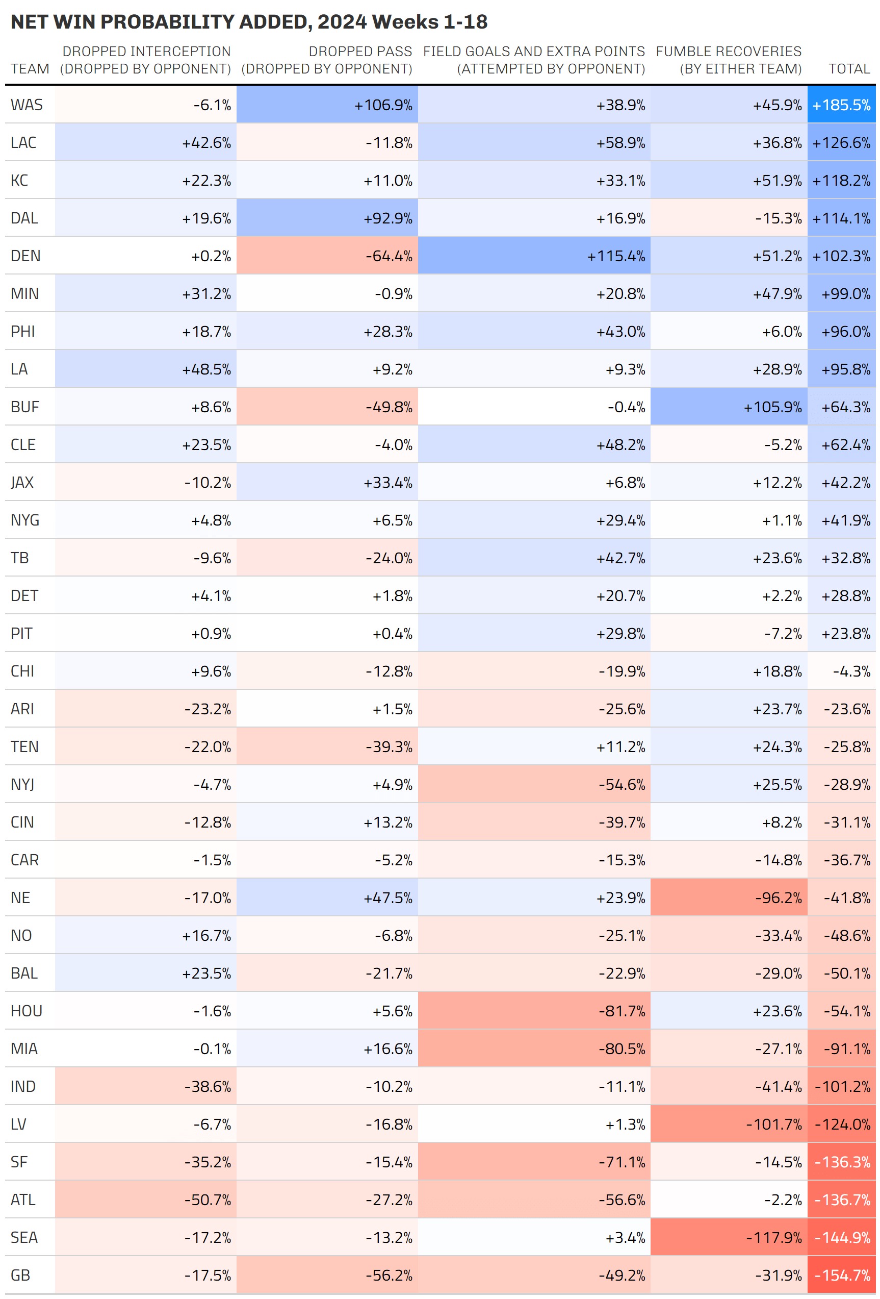 Teams can also be postively or negatively affected by what essentially are luck factors. For example, normally a team has a 50% chance of recovering a fumble as history has shown. So, a team that recovers 75% of fumbles in a given season can be said to have had extraordinary good luck in that regard- something that isn’t likely to carryover into future seasons. Similarly, dropped passes or those dropped by an opponent at an above average rate is attributable to a team’s luck, as is the case with interceptions. As I mentioned in my predictions for the other NFC North teams this year, I am going with a blend of the Net Win Probability Added chart (below) and the TeamRankings luck factors, which is based on estimated wins compared to actual wins. Estimated wins is a play-by-play analysis of a game that determines the outcome based on the collective probability of outcome based on each play situation. For example, a team that converts a high percentage of 3rd and long situations to win the game narrowly is beating the odds and so is seen to be lucky in that regard.