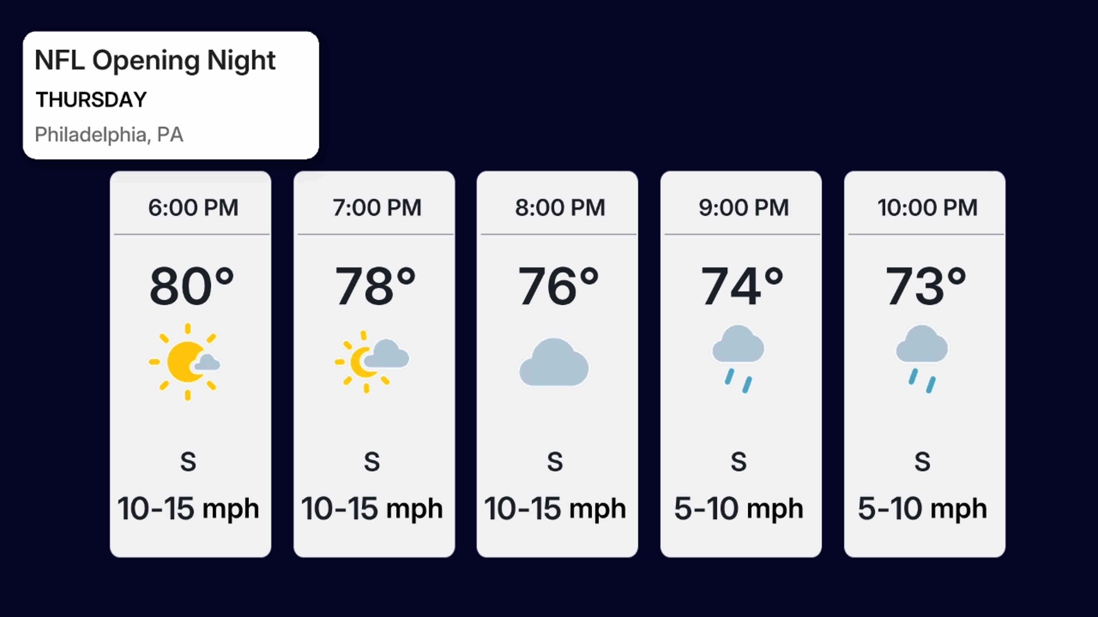 For those of you making the trek to Philly for the game, the afternoon hours will be perfect for tailgating. Sunny skies and temperatures in the low to mid-80s are in the forecast before game time.