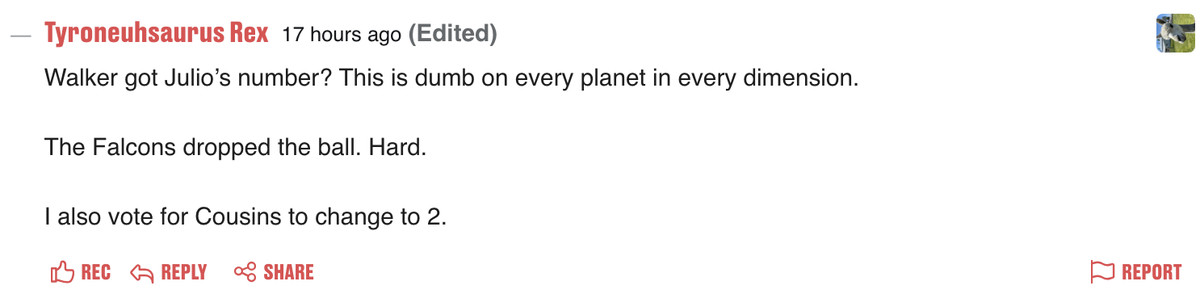 Brass tacks: Regardless of how players leave a franchise they often mend the relationship in time. Julio Jones’ No. 11 deserves to be put in the rafters, or at the very least give it a solid decade before trying to hand it off to someone else. This just feels disrespectful.