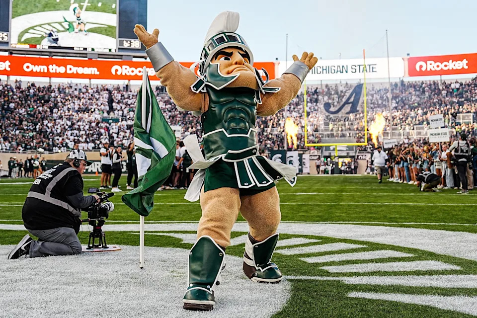 Aug. 29: Michigan State mascot Sparty takes the field ahead of the game against Western Michigan at Spartan Stadium in East Lansing, Michigan. Michigan State won the game, 23-6.