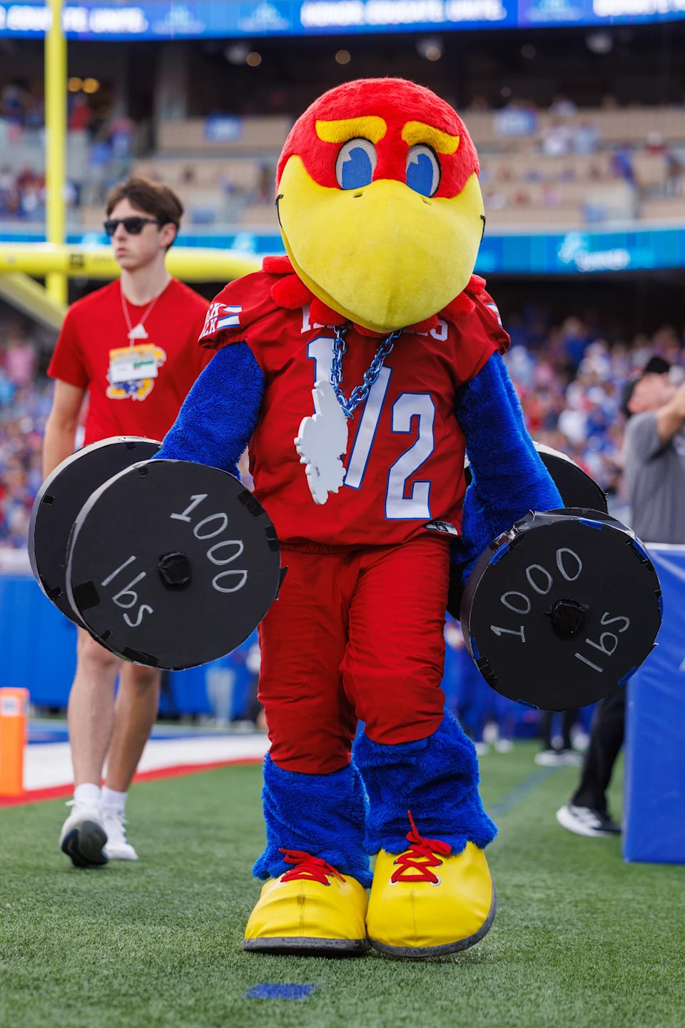 Aug. 29: Kansas Jayhawks mascot Little Jay hangs out on the sidelines during the game against Wagner at David Booth Kansas Memorial Stadium. Kansas won the game, 46-7.