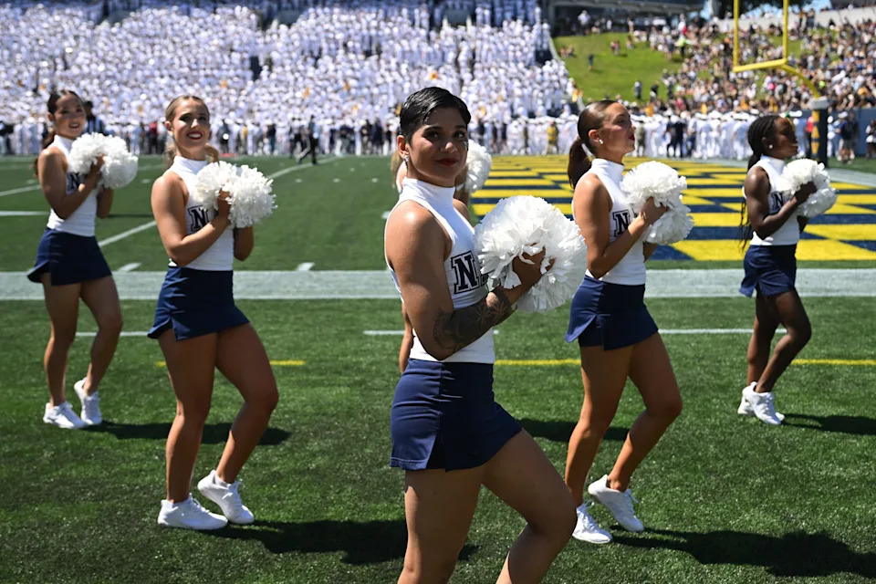 Aug. 30: Navy Midshipmen cheerleaders perform during the game against the Virginia Military Institute Keydets at Navy-Marine Corps Memorial Stadium.