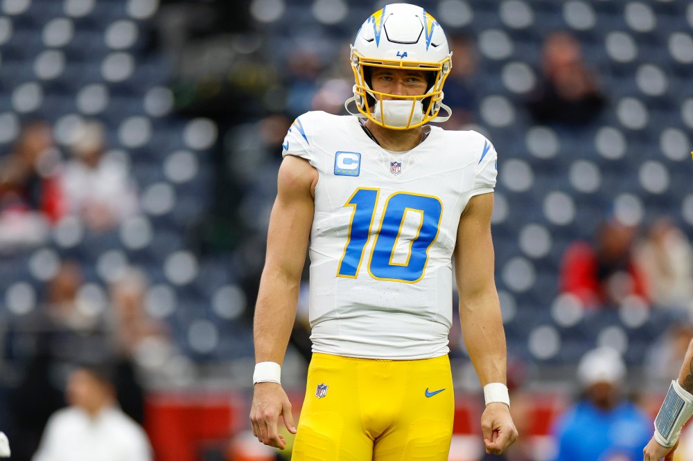 HOUSTON, TEXAS – JANUARY 11: Justin Herbert #10 of the Los Angeles Chargers warms up on the field prior to the AFC Wild Card Playoff game against the Houston Texans at NRG Stadium on January 11, 2025 in Houston, Texas. (Photo by Brandon Sloter/Getty Images)