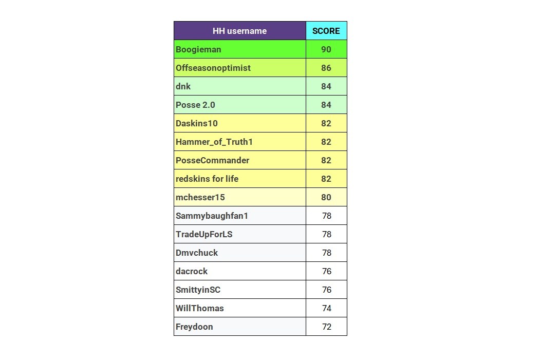 Congratulations to Boogieman on his win, and to the rest of the entrants on well-thought-out and high-scoring entries. The overall accuracy of the entries is a testament to a fan base who is extremely knowledgeable about the relative unknowns at the bottom of the Commanders roster in 2025. Truly arcane knowledge!