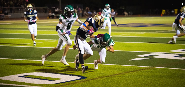 QUEEN CREEK – In a clash of Arizona high school football titans, the No. 2-ranked Benjamin Franklin Chargers (3-0) handed the No. 4-ranked Thatcher Eagles (2-1) their first loss of the season, securing a decisive 27-12 win on the road Friday night. The Chargers’ balanced attack, led by senior running back Landon Stetka’s career-high 170 rushing yards and two touchdowns, proved too much for Thatcher, ending the Eagles’ undefeated start.