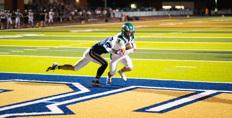 Steve Carter Photo/Gila Herald: Ryker Romero (2) crosses the goal line. Thatcher was up early, 12-7.