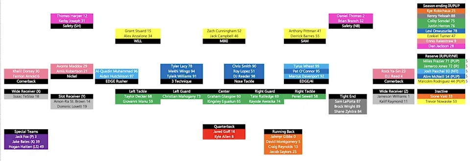 WILL Malcolm Rodriguez (44) — Reserve/PUP — eligible to return in Week 5