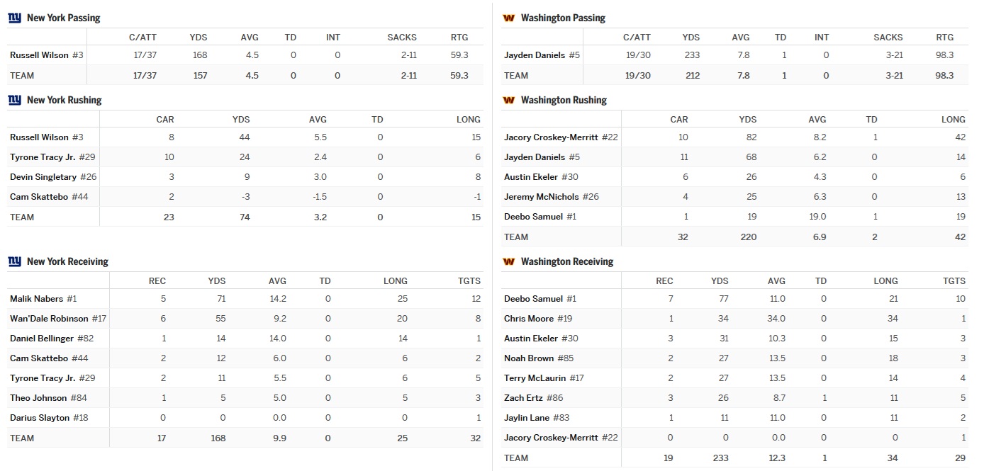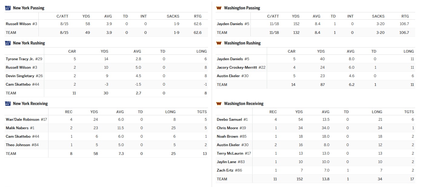 Under heavy pressure, Wilson got rid of the ball to Skattebo on a checkdown to bring up 3rd & 13. On the 3rd down play, Daron Payne knocked down Wilson’s pass to force 4th down and a 55-yard field goal attempt by Graham Gano, who nailed it to make the score 14-6 with 01:43 left in the quarter.
