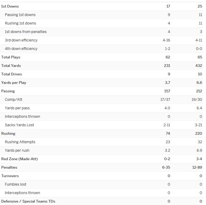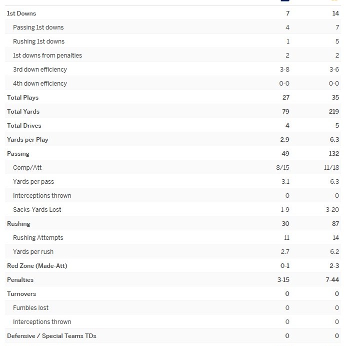 On 3rd & 1, Daniels threw the ball to nobody and got flagged for intentional grounding. With the 10-second runoff, the half came to an end.