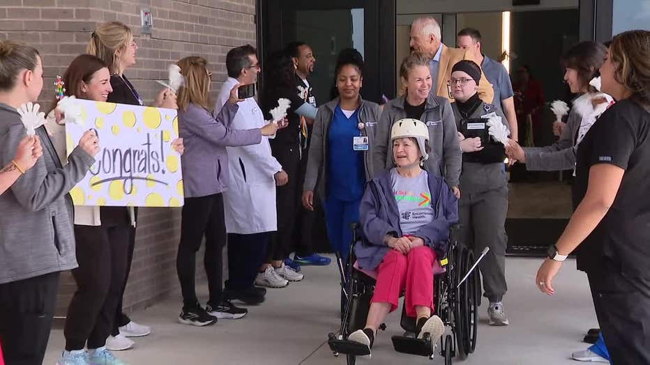 Doctors and medical staff lined the hallway to cheer her on as she was wheeled out with her husband and son alongside her side.