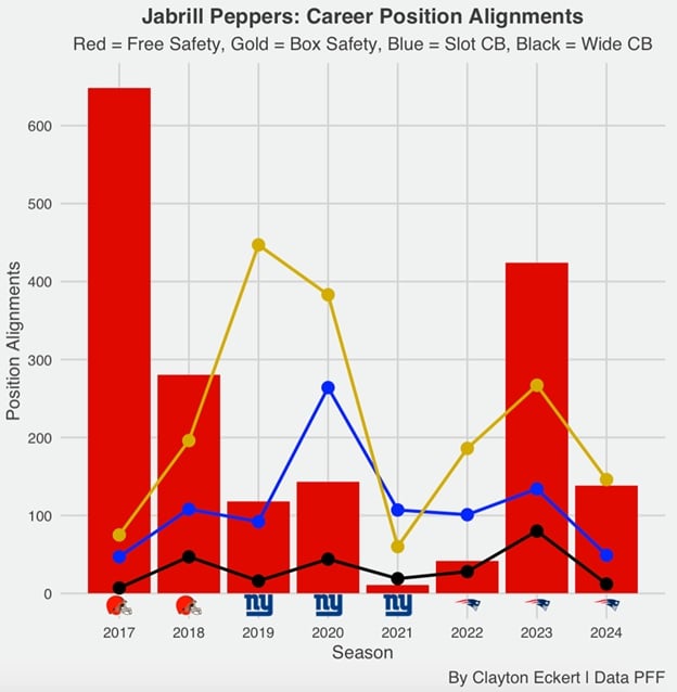 Clearly, we see that Peppers has been a very versatile piece in the secondary for the teams he’s played for to date. Free safety leads the way, with 1,804 career snaps, thanks to a couple seasons in particular. Namely as a rookie for Cleveland, along with 2023 as a Patriot.