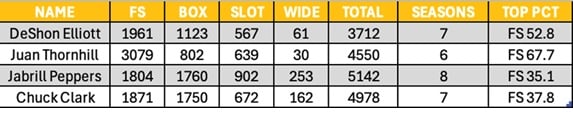 Now that Peppers’ career position alignments have been laid out, here’s a table of Steelers top four safeties careers (pre-2025) to gain more context. I also included snaps of the four secondary positions, total snaps, number of seasons, and top alignment percentages (TOP PCT) by position: