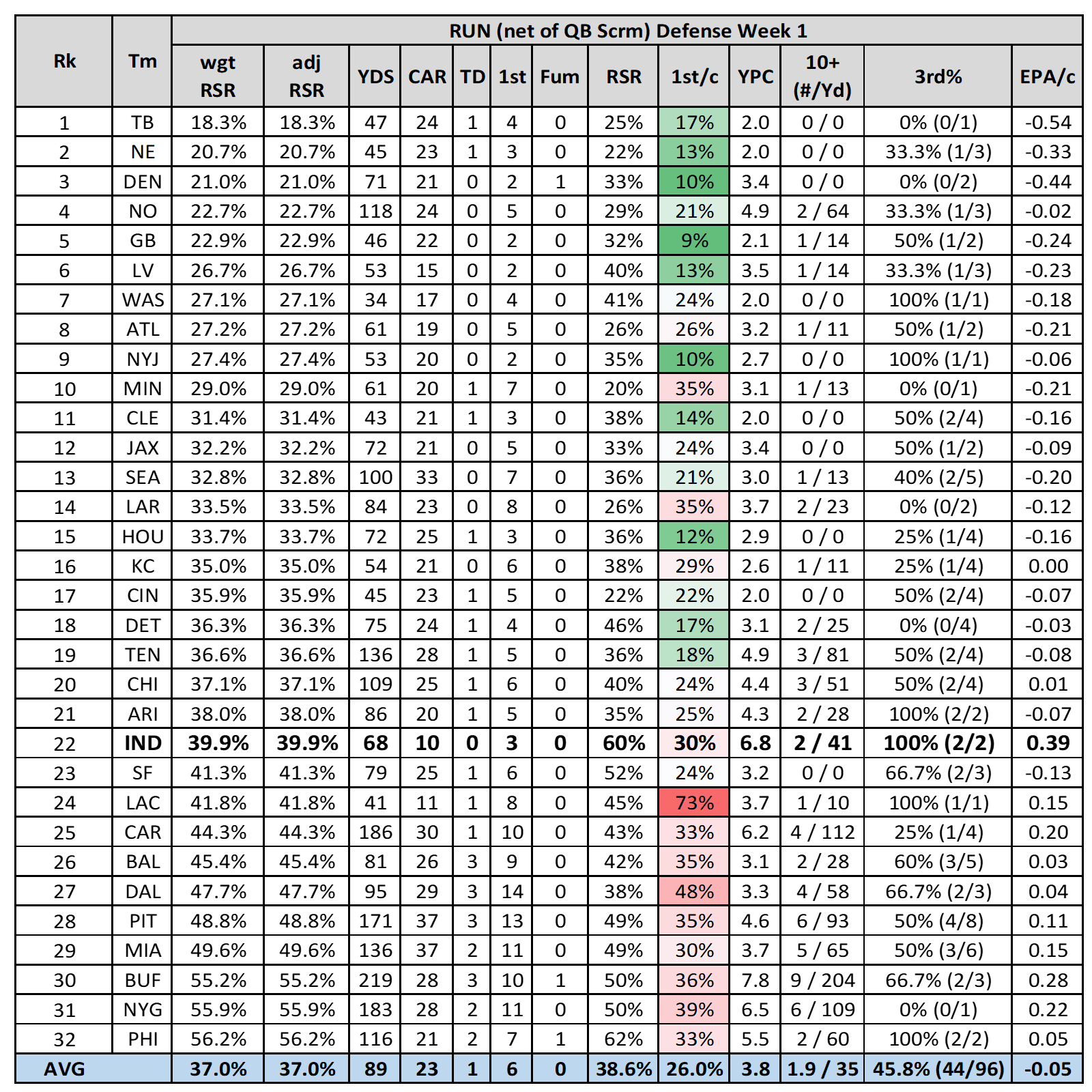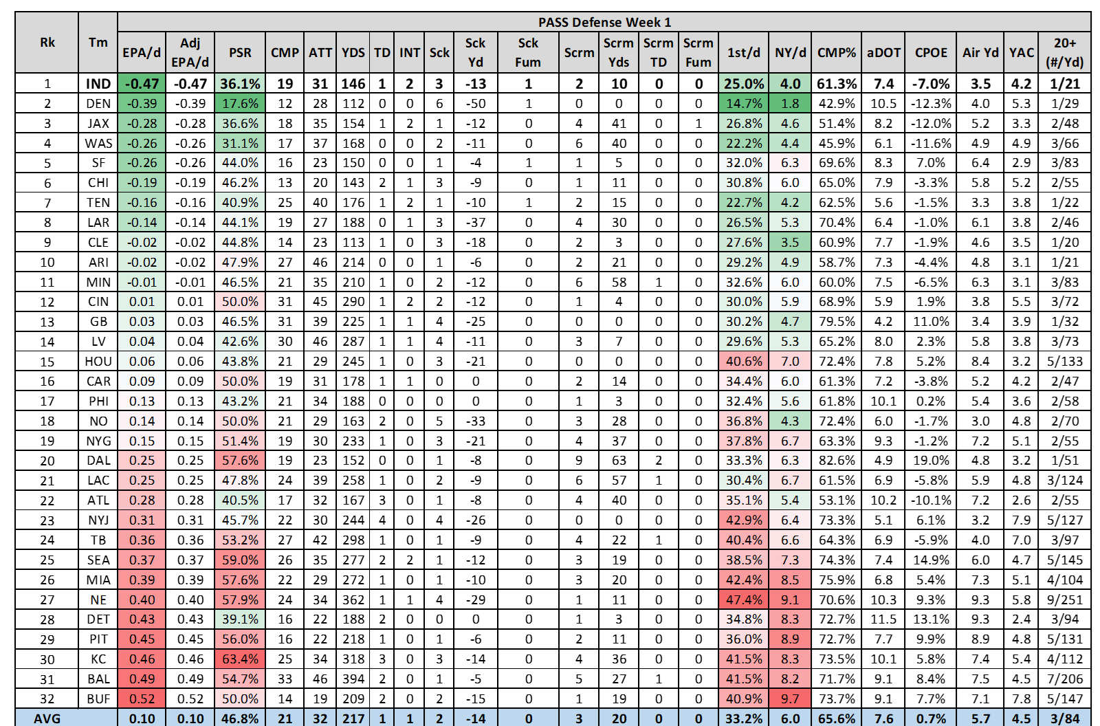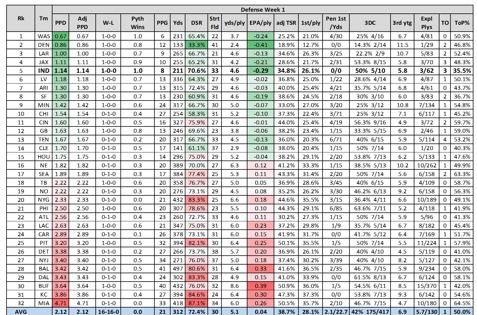 In my offensive stats article, I highlighted first downs as a critical stat for measuring performance. Similarly, preventing first downs is critical for a defense. Miami managed only 12 first downs — the third-fewest of any Week 1 team, which shows how the Colts kept the Dolphins from moving down the field.