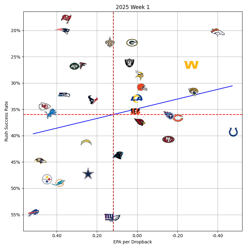 However, the Colts were far less effective against the run. Game script limited Miami to just 10 rushing attempts, but those carries produced the highest rushing EPA rate of the week. The Dolphins converted 100% of their third-down runs and broke off two explosive carries for over 40 yards.