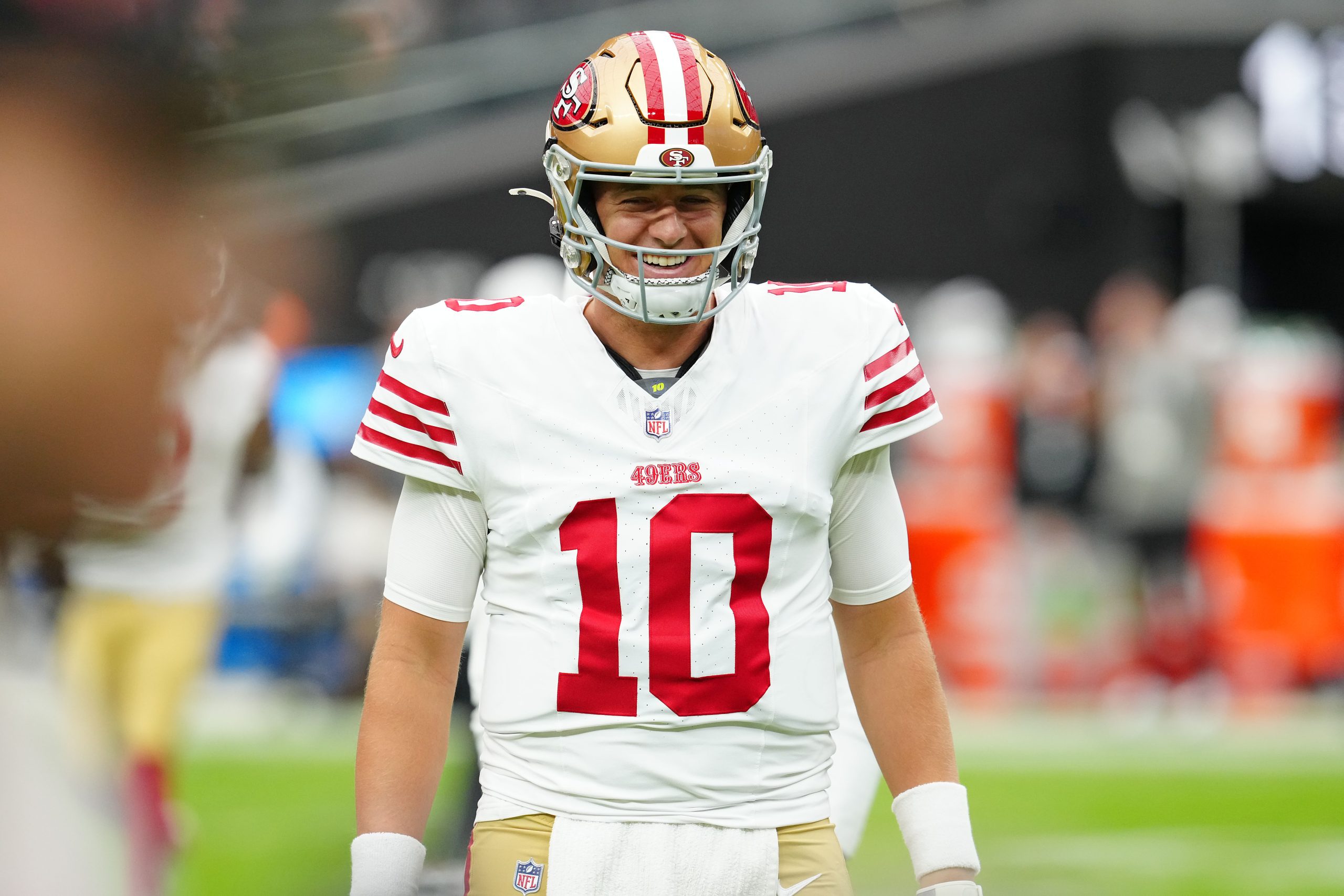 Aug 16, 2025; Paradise, Nevada, USA; San Francisco 49ers quarterback Mac Jones (10) warms up before a preseason game against the Las Vegas Raiders at Allegiant Stadium. Mandatory Credit: Stephen R. Sylvanie-Imagn Images
