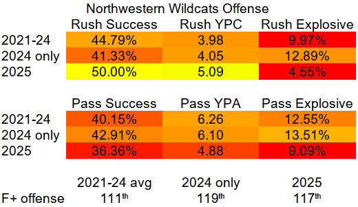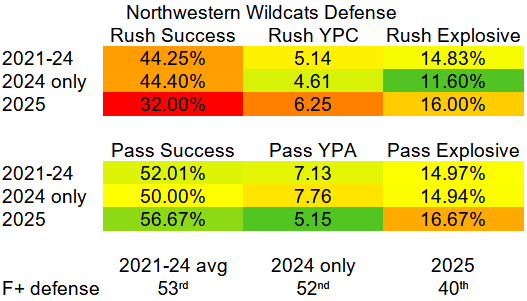 I’ve given this quite a bit of thought and with the data so far from the new season as well as talking with Charlie — we had an interesting philosophical discussion about Big Ten defenses on the podcast — I think there are three major components to the miss. The most significant has already been mentioned: the offense picking up the tempo but not the 3rd down conversion or scoring rate just gassed the defense, and the way that the Wildcats’ low recruiting profile manifests is not so much the frontline players but the lack of quality depth behind them, so the defense fell off hard when they kept having to take the field. The second issue was an injury problem in the secondary that caused a redshirt freshman to have to start most of the year who got picked on, resulting in an uptick by a full yard per passing attempt for opposing offenses … I was willing to discount this earlier but if anything secondary injury issues have worsened in 2025 and the matter requires even more attention by staff and those who care to monitor them.