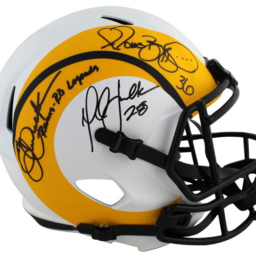 I found this signed helmet on premierecollectibles.com: It’s a helmet signed by Marshall Faulk, Erick Dickerson, and Jerome Bettis. It’s selling for over $600. Too rich?
