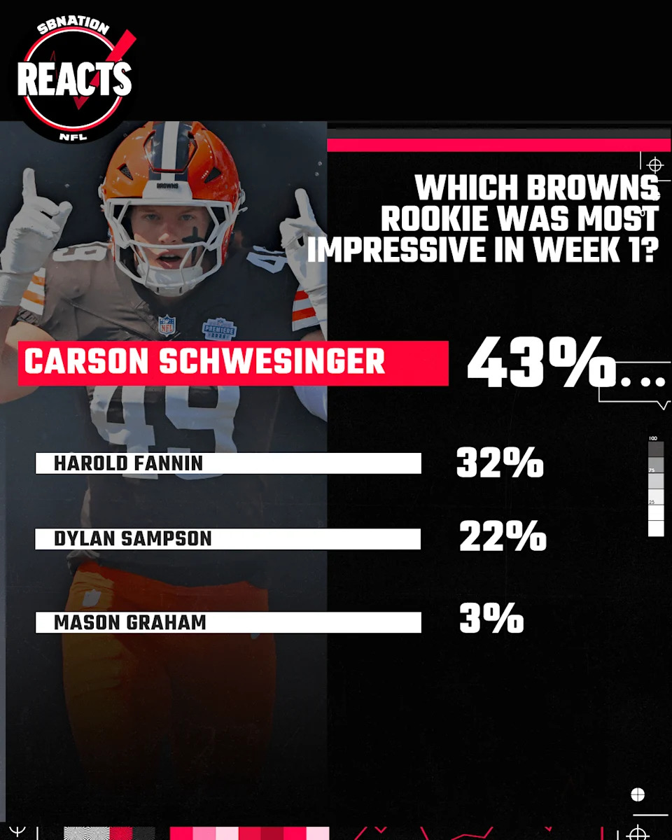 We asked two other questions this week. The first one asked who fans thought the most impressive rookie was in Week 1 for Cleveland. There were a lot of candidates, but LB Carson Schwesinger was the leading vote-getter with 43% of the vote. That was followed by TE Harold Fannin (32%), RB Dylan Sampson (22%), and DT Mason Graham (3%).