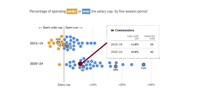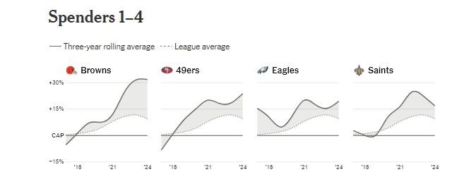 There’s some expectation Washington will move up in cash-over-cap spending under new ownership (the Commanders rank 16th in 2025).