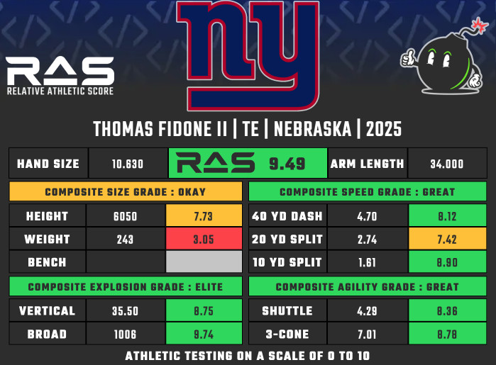 Fidone is a long tight end at 6-foot-5 with 34-inch arms and 10⅝-inch hands. He’s a bit on the lean side at 243 pounds, but is a willing blocker as well as a good route runner. Fidone isn’t quite as athletic as Daniel Bellinger and Theo Johnson, but the Giants now have an impressive collection of big, fast tight ends to attack seams.