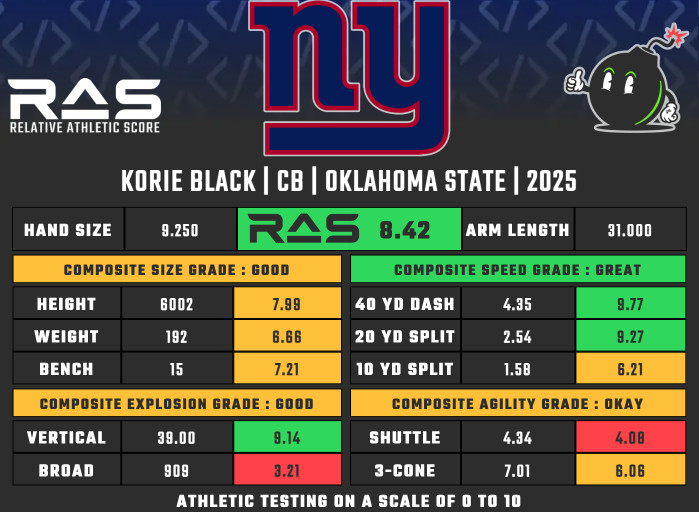 Black is a good sized corner at 6-foot, 192 pounds, as well as 4.3 speed. He also has 3 interceptions and 9 passes defensed in his last year at Oklahoma State.