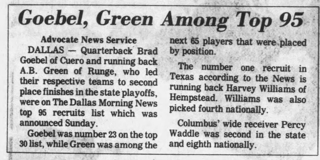 In 1986, Goebel led Cuero to a 3A state championship. He spent five years in the NFL as a backup with the Philadelphia Eagles, Cleveland Browns, and Jacksonville Jaguars.